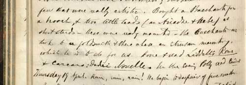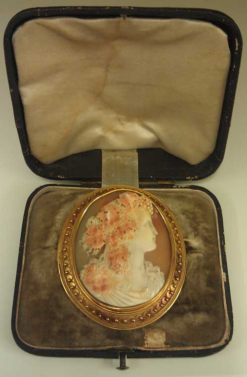 In 1860 George Eliot and George Henry Lewes visited Rome, Italy, where Eliot obtained an engraved shell cameo which she and Lewes had jeweller Cesare Tombini set in a gold mount of Etruscan design. In his diary for April 18th, 1860 Lewes describes purchasing the brooch: “Bought a Bacchante for a brooch, and two little heads (an Ariadne and Thebe) as shirt studs. [ . . . ] The Bacchante we took to a goldsmith and there chose an Etruscan mounting.”